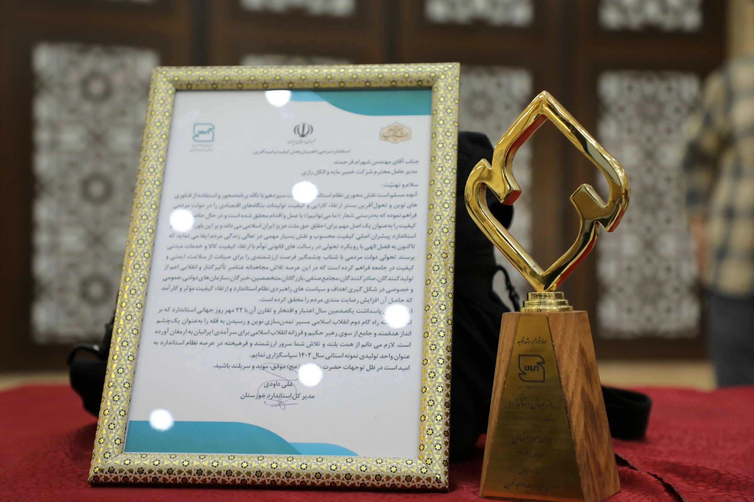 در آیین معرفی و تجلیل از واحدهای نمونه تولیدی استان خوزستان ویژه سال 1402 لوح و تندیس واحد نمونه استاندارد به شرکت خمیرمایه و الکل رازی رسید.