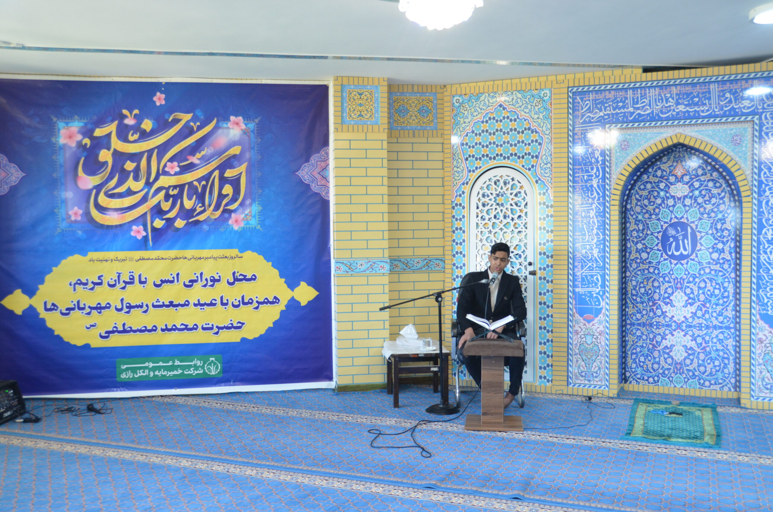 همزمان با ایام عید مبعث پیامبر گرامی اسلام (ص)، محفل نورانی انس با قرآن کریم با حضور قاری ممتاز و بین المللی، سید جاسم موسوی در شرکت خمیرمایه و الکل رازی برگزار و آیاتی از کلام وحی تلاوت شد.